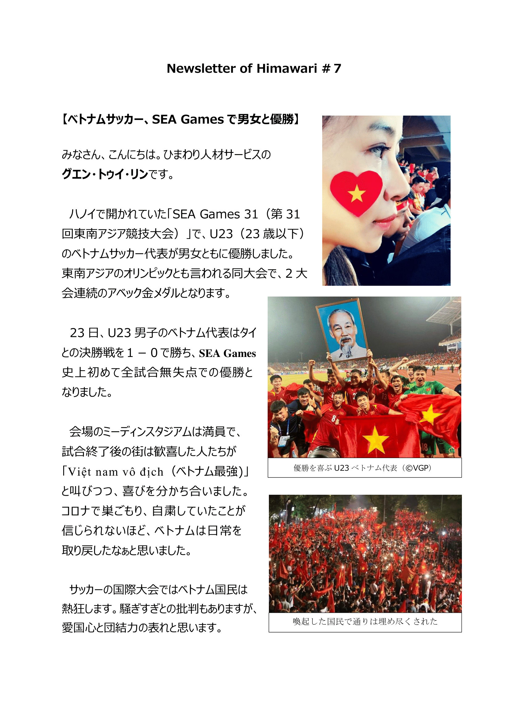 Newsletter 7: ベトナムサッカー、SEA Gamesで男女と優勝